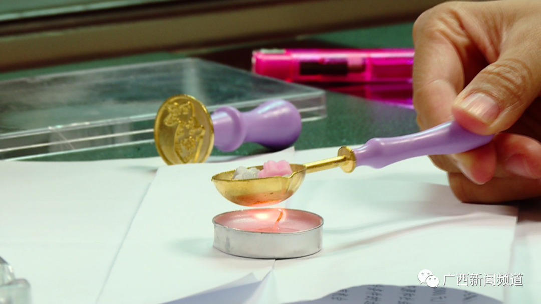 广西新闻频道记者 谭丽娜 :这个火漆印章里面有一个蜡烛,还有一个勺子,还有一个印章,还有几块可以拿来融化的蜡粒,找了这个印章的包装盒,发现它上面并没有写使用说明,这些道具是怎么使用的,我们只能根据网上的提示来操作。应该是先把蜡烛点燃。
