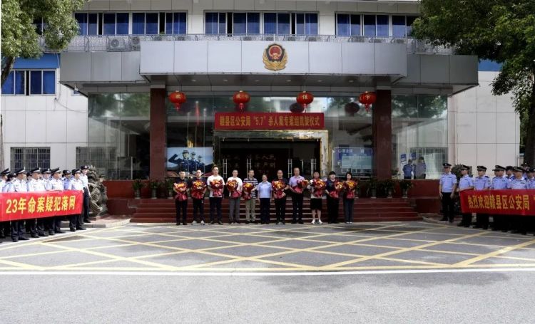 近日,赣州赣县区公安局在局大院举行了一场隆重的欢迎仪式,热烈欢迎赴浙江省临海市开展抓捕工作的刑侦专案组凯旋。仪式上,“2000·05·07”杀人案专案组受到了民辅警的热烈欢迎。