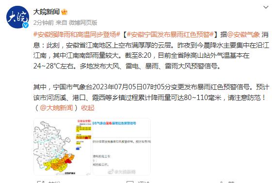 其中,宁国市气象台2023年07月05日07时05分变更发布暴雨红色预警信号。预计该市河沥溪、港口、霞西等乡镇过程累计降雨量可达80~110毫米,请注意防范!