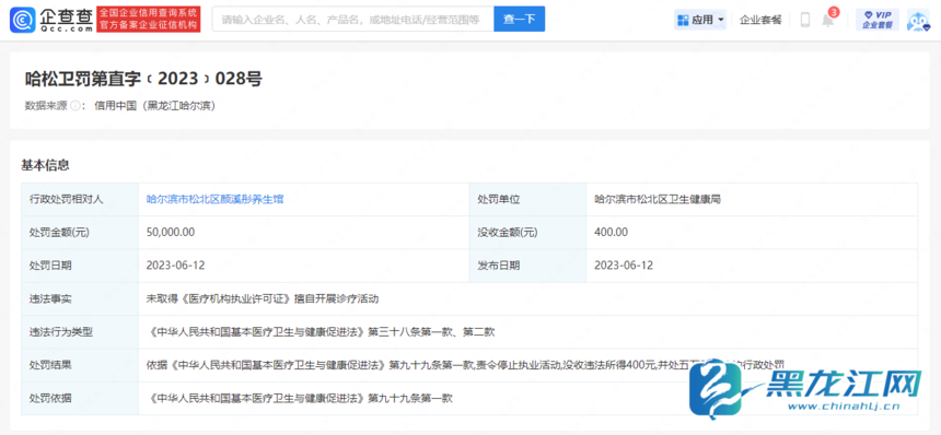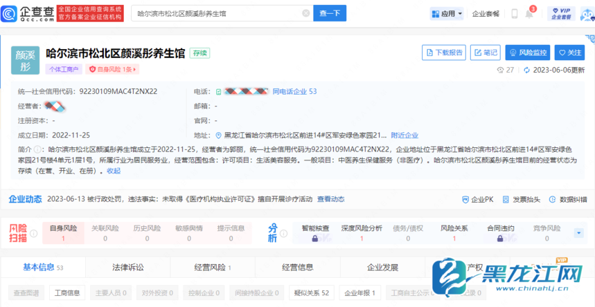 李女士称,目前已经接到处罚结果,“我现在已经关店了,并且注销了营业执照。”但记者在企查查搜索后发现,沐兮养生馆注册的企业名称为“哈尔滨市松北区颜溪彤养生馆”,目前的登记状态仍显示“存续”,并显示有1条自身风险。