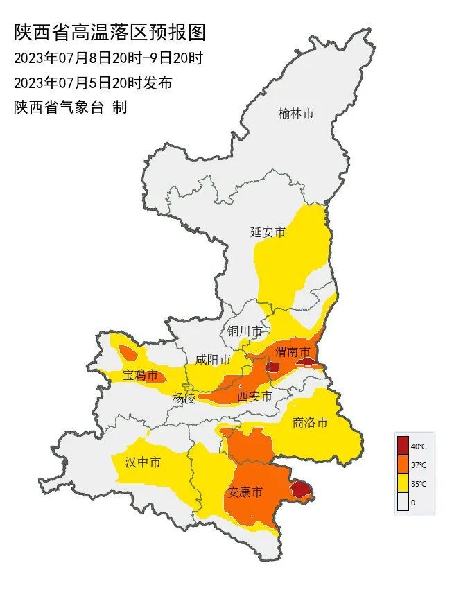 7日和9日关中、陕南大部有35~37℃的高温 ,宝鸡中部、咸阳南部、西安部分、渭南南部、杨凌、安康东部、商洛西部可达38~40℃ 。10日高温范围减小,关中中东部有35~37℃的 高温,局地可达38℃以上。