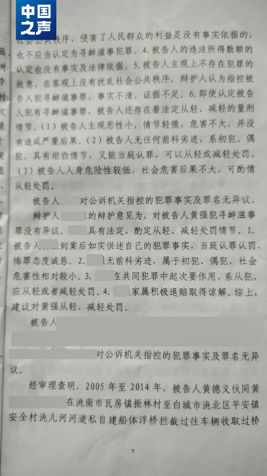 2019年12月31日,洮南市法院做出一审判决。法院认定,黄德义及其他人员于2005年至2014年搭建船体浮桥收取过桥费;2014年至2018年搭建固定浮桥,黄德义组织排班并制定收费标准,小车5元大车10元,拦截过往车辆收取过桥费、过路费总计52950元,其行为构成寻衅滋事罪,判处黄德义有期徒刑两年,缓刑两年,其他17人也分别被判刑。