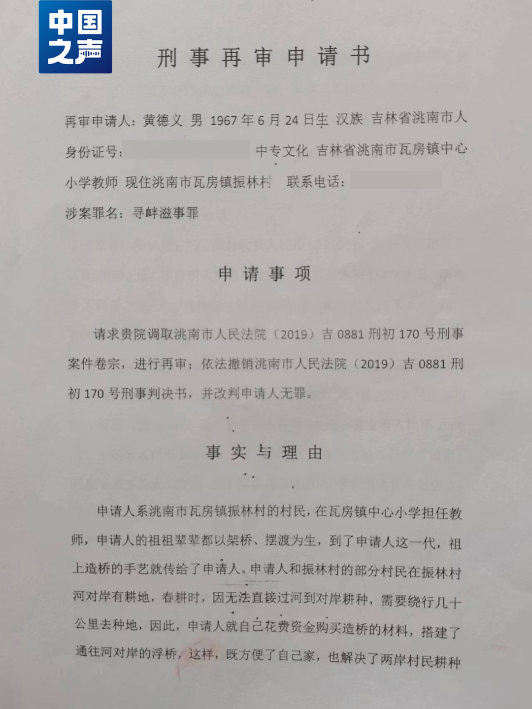 一审判决后,黄德义并未提出上诉。他说,自己越想越觉得冤枉,就在2021年底提出了申诉。今年3月31日,黄德义的申诉被洮南市法院驳回,理由是法院认为,其在未经有关部门批准的情况下,私自建桥拦截过往车辆收费,且受到多次行政处罚的情况下仍拒不改正,情节恶劣,构成寻衅滋事罪的犯罪事实。申诉不符合相关法律规定,应予驳回。