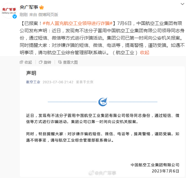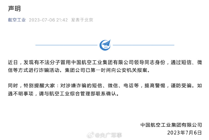 7月6日,中国航空工业集团有限公司发布声明:近日,发现有不法分子冒用中国航空工业集团有限公司领导同志身份,通过短信、微信等方式进行诈骗活动。集团公司已第一时间向公安机关报案。同时提醒大家:对涉嫌诈骗的短信、微信、电话等,提高警惕,谨防受骗。如遇不明事项,请与航空工业综合管理部联系确认。
