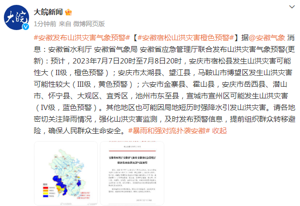 据@安徽气象 消息:安徽省水利厅 安徽省气象局 安徽省应急管理厅联合发布山洪灾害气象预警(更新):预计,2023年7月7日20时至7月8日20时,安庆市宿松县发生山洪灾害可能性大(II级,橙色预警);安庆市太湖县、望江县,马鞍山市博望区发生山洪灾害可能性较大(III级,黄色预警);六安市金寨县、霍山县,安庆市岳西县、潜山市、怀宁县、大观区、宜秀区,池州市东至县,宣城市宣州区可能发生山洪灾害(IV级,蓝色预警)。其他地区也可能因局地短历时强降水引发山洪灾害。请各地密切关注降雨情况,强化山洪灾害监测,及时发布预警信息,提前组织群众转移避险,确保人民群众生命安全。