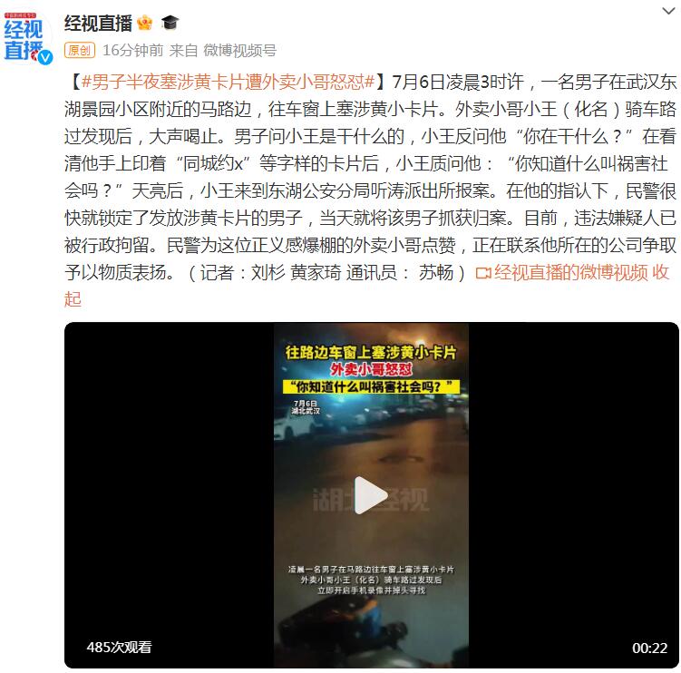 7月6日凌晨3时许,一名男子在武汉东湖景园小区附近的马路边,往车窗上塞涉黄小卡片。外卖小哥小王(化名)骑车路过发现后,大声喝止。男子问小王是干什么的,小王反问他“你在干什么?”在看清他手上印着“同城约x”等字样的卡片后,小王质问他:“你知道什么叫祸害社会吗?”天亮后,小王来到东湖公安分局听涛派出所报案。在他的指认下,民警很快就锁定了发放涉黄卡片的男子,当天就将该男子抓获归案。目前,违法嫌疑人已被行政拘留。民警为这位正义感爆棚的外卖小哥点赞,正在联系他所在的公司争取予以物质表扬。(记者:刘杉 黄家琦 通讯员: 苏畅)