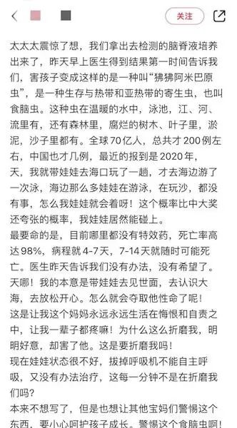 近期,一位妈妈在社交平台发布了6岁儿子在海边游泳后感染“自由生活阿米巴”致脑病的经历。让人揪心的是,这个病没有特效药 ,仍是当今医疗界的治疗难题。暑假期间,家长带娃旅游需要注意什么?