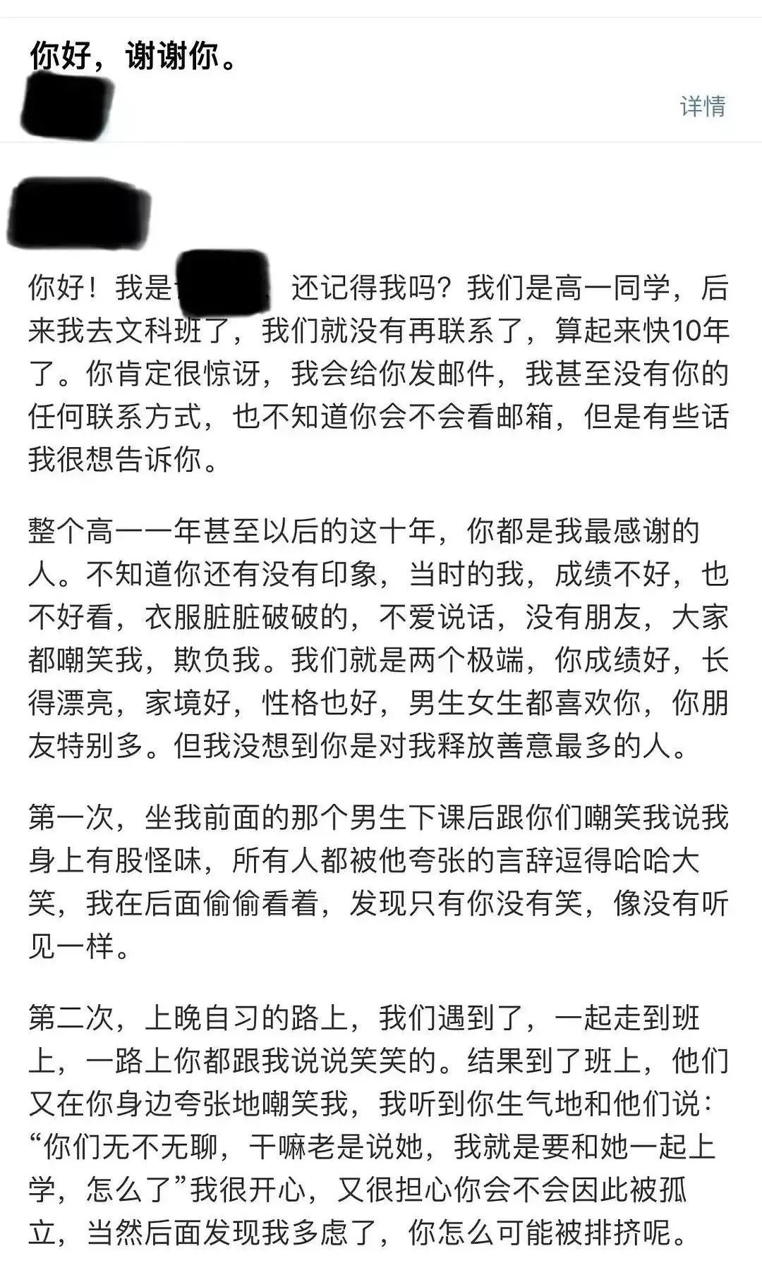 前段时间,有个帖子感动了很多人。作者说她突然收到了一封高中同学的邮件,看完哭得稀里哗啦: