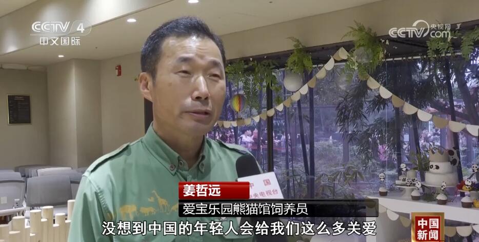 爱宝乐园熊猫馆饲养员 姜哲远: 没想到中国的年轻人会给我们这么多关爱,非常感谢也非常珍惜大家给我们的关注。我能做的事情其实就是像现在这样,让福宝继续茁壮成长。