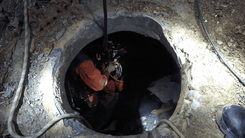消防救援人员下入化粪池