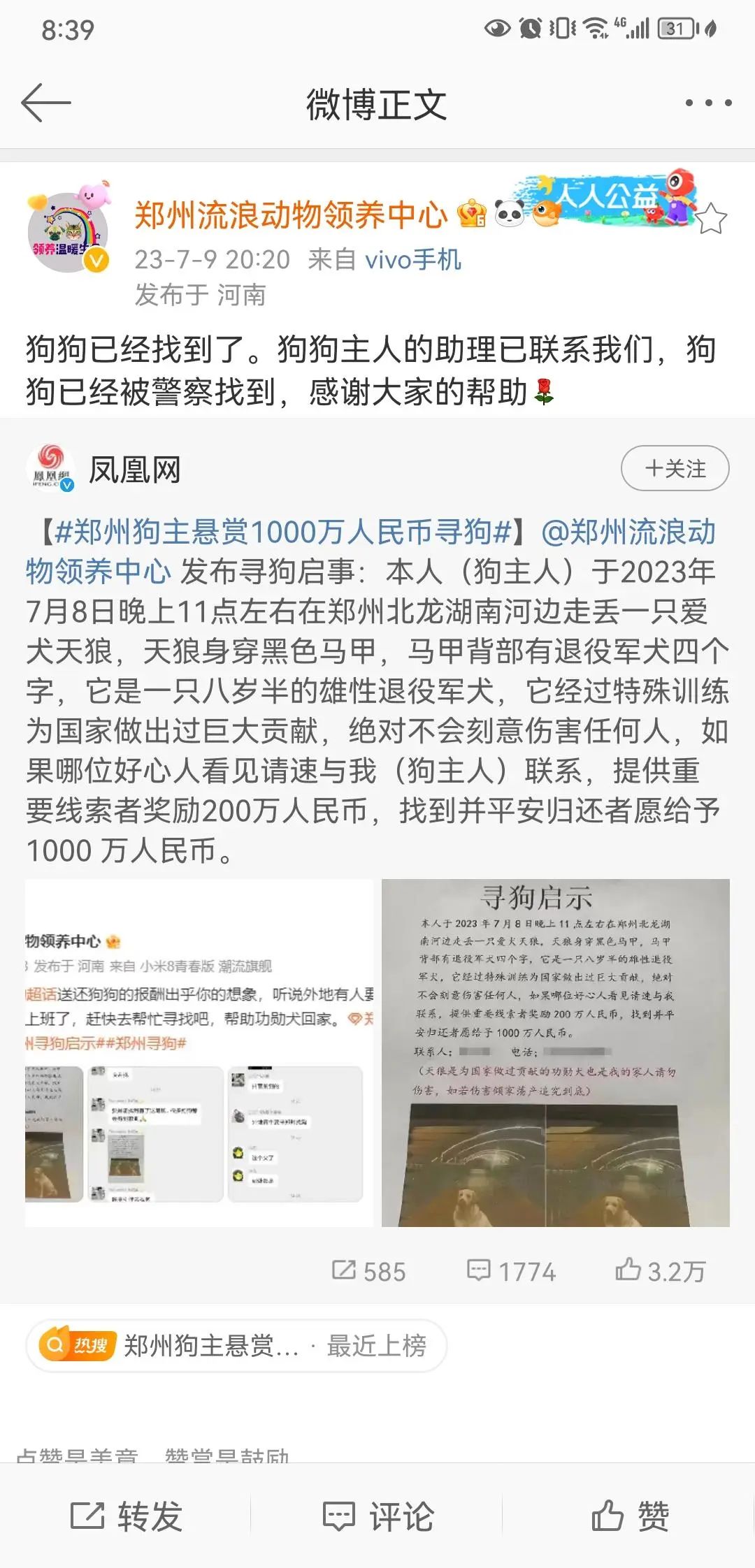 7月9日,“郑州流浪动物领养中心”发布了一则特殊的寻狗启事,如果能提供重要线索者,狗主人奖励200万人民币,如果找到并平安归还,狗主人愿给予1000万人民币。此启事一出,引发网友热议。
