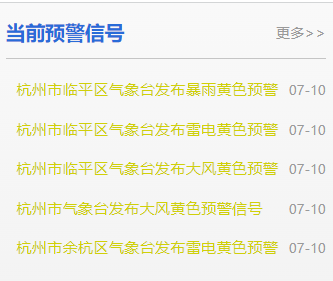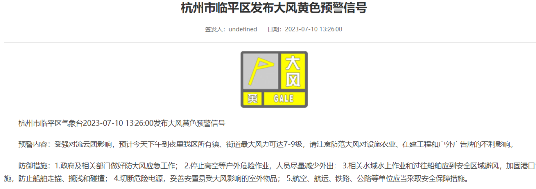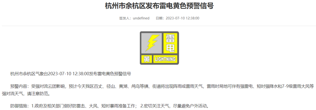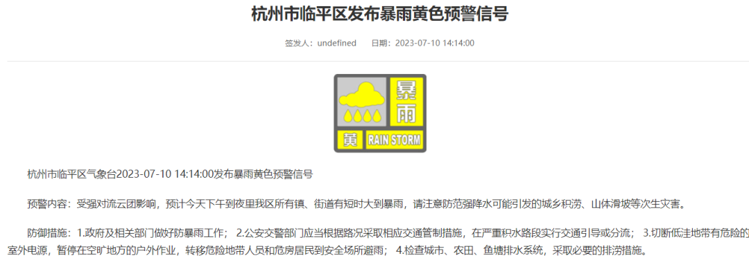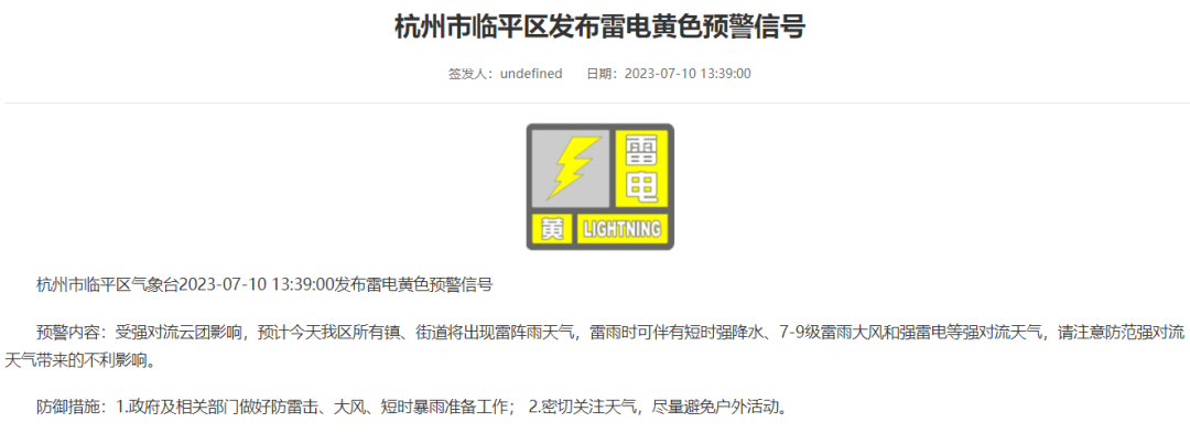 截至目前,余杭区发布雷电黄色预警;临平区发布大风、雷电、暴雨黄色预警信号。请注意防范↓