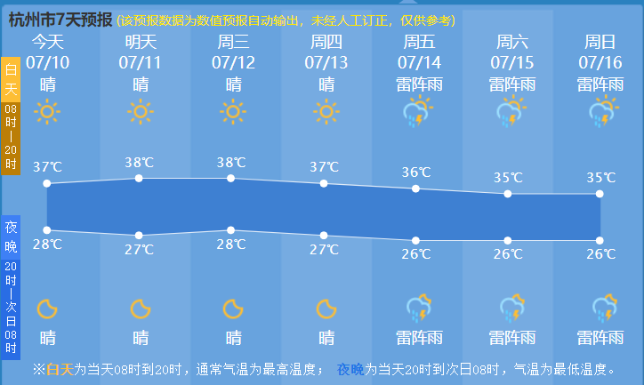 杭州市气象台发布高温报告:受副热带高压影响,预计未来五天我市持续高温,最高气温可达35~37℃,局部38℃以上,请注意做好防暑降温工作。