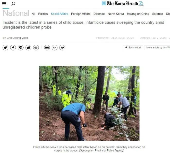 2023年7月2日,韩国庆尚南道警方称,已向一名20多岁的男子和一名30多岁的女子发出逮捕令,原因是他们勒死了自己的孩子,并将尸体丢弃在庆尚南道巨济附近的一条河里 。
