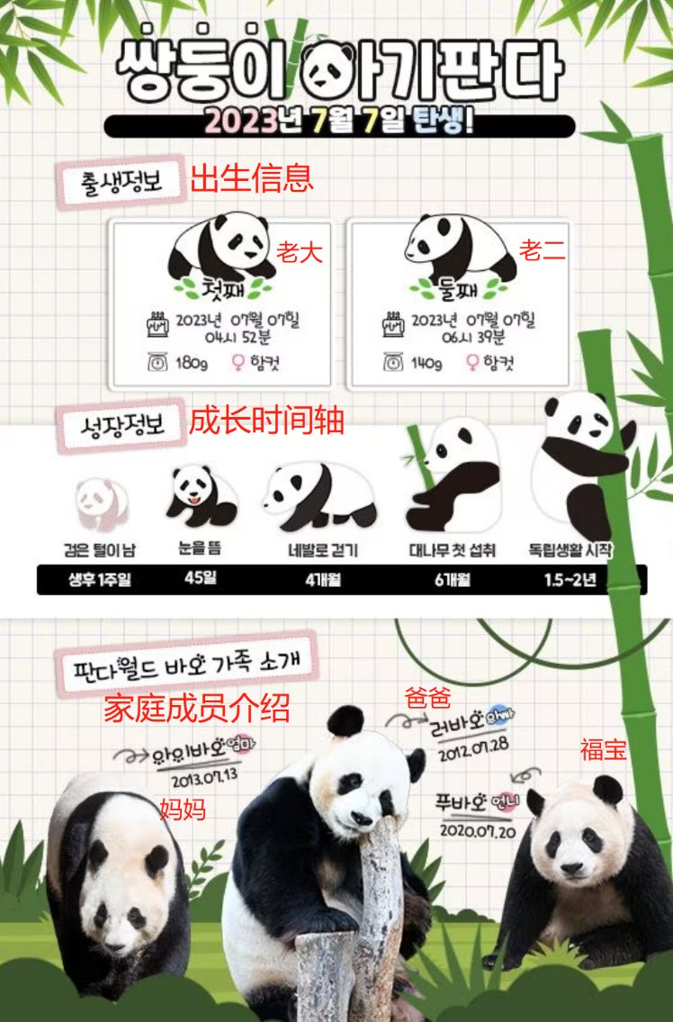 韩国《朝鲜日报》11日发布的这张海报,标题为《大熊猫双胞胎幼崽 2023年7月7日诞生!》,内容分三部分。其中,第一部分是“出生信息”,介绍了这对幼崽的出生时间、体重和性别。