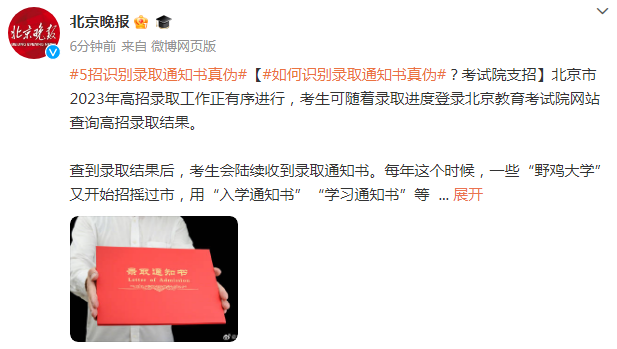 考生要通过正规渠道查询录取结果。北京考生可根据录取进程安排陆续查询录取结果。考生除了可通过北京教育考试院网站查询,还可通过报考的高校招生网站查询录取结果。如果考生通过这些方式查到自己没有被录取却收到了录取通知书,那么收到的录取通知书也是假的。