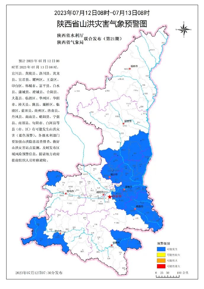 陕西省水利厅与陕西省气象局联合发布山洪灾害气象预警: 预计2023年07月12日08时至2023年07月13日08时,宜川县、黄陵县、洛川县、黄龙县、宜君县、耀州区、王益区、印台区、韩城市、富平县、白水县、蒲城县、澄城县、合阳县、大荔县、临渭区、华州区、华阴市、潼关县、陇县、灞桥区、临潼区、蓝田县、商州区、洛南县、丹凤县、商南县、略阳县、宁强县、南郑县、旬阳市、白河县等县(市、区)有可能发生山洪灾害(蓝色预警) 。各级水利部门要加强山洪隐患巡查排查,做好山洪灾害站点监测,及时发布区域风险预警信息,提请地方政府提前组织人员转移避险。