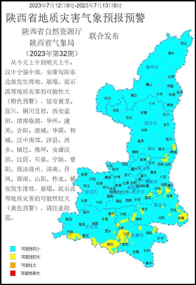 陕西省自然资源厅与陕西省气象局联合发布地质灾害气象预报预警: 预计2023年7月12日8时至2023年7月13日8时,汉中宁强中部,安康旬阳东北部发生滑坡、崩塌、泥石流等地质灾害的可能性大(橙色预警) ,延安黄龙、宜川,铜川宜君,西安蓝田,渭南临渭、华州、潼关、合阳、澄城、华阴、韩城,汉中南郑、洋县、西乡、镇巴、佛坪,安康汉滨、汉阴、石泉、宁陕、紫阳,商洛商州、洛南、丹凤、商南、山阳、柞水、镇安发生滑坡、崩塌、泥石流等地质灾害的可能性较大(黄色预警),请注意防范。