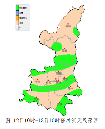 陕西省气象台2023年07月12日10时00分发布强对流黄色预警: 受副高外围暖湿气流和低层切变共同影响,预计今天白天至夜间全省大部地区有雷暴天气,榆林东部、延安西部及南部、铜川、渭南部分、咸阳北部、西安南部、宝鸡部分、汉中西部、商洛部分、安康东部局地有短时暴雨,最大小时雨强20-40mm/h,单点可达50mm/h以上,局地伴有7-9级雷暴大风。