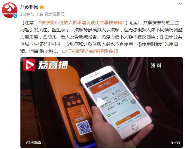 近期,共享按摩椅的卫生问题引发关注。医生表示:按摩椅虽模拟人手按摩,但无法根据人体不同情况调整力度角度,①幼儿、老人及骨质疏松者、免疫力低下人群不建议使用;②由于公共区域卫生情况不可控,皮肤病和过敏体质人群也不宜使用;③使用时最好先用酒精、消毒湿巾擦拭。