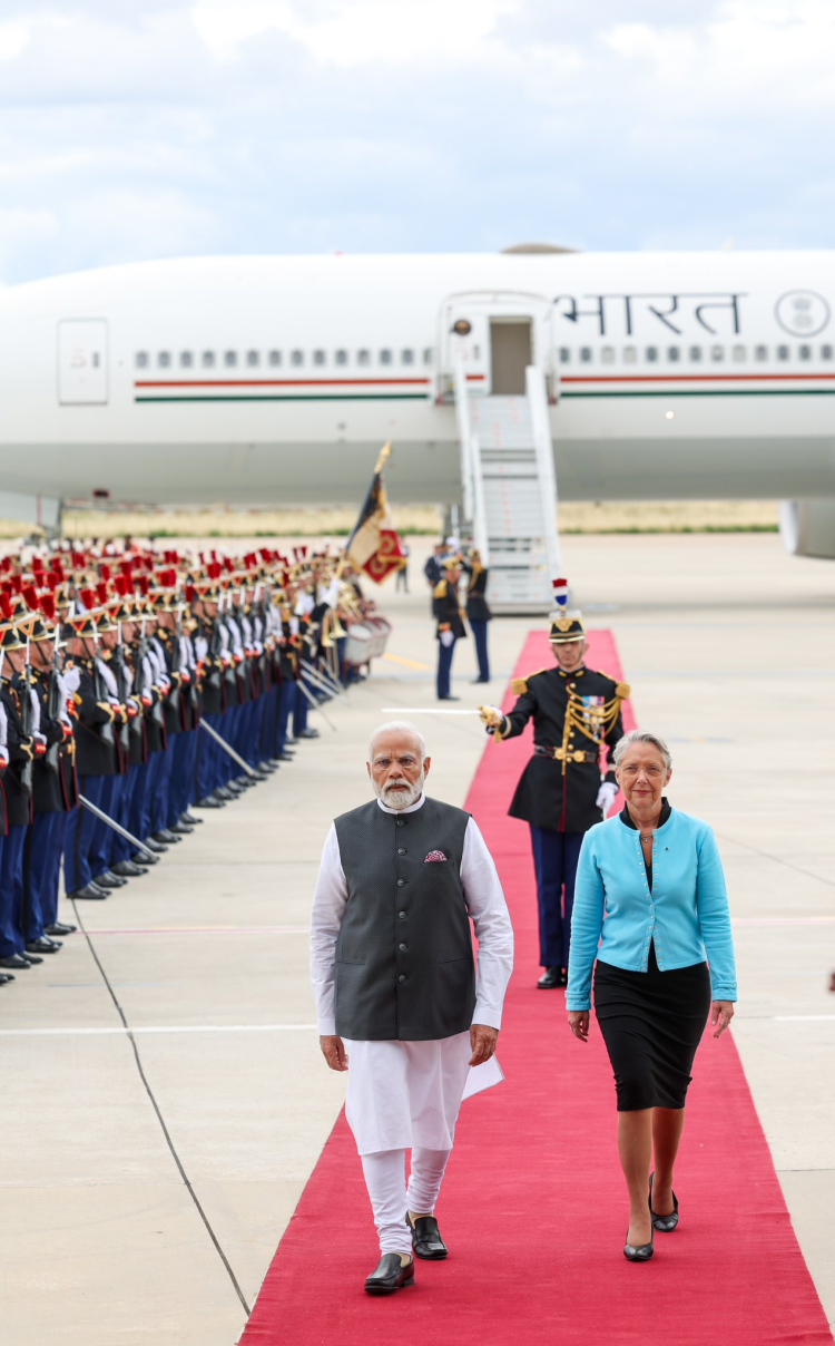 法新社记者看到,莫迪在巴黎南郊奥利机场受到法国总理伊丽莎白•博尔内和仪仗队欢迎,随后莫迪将与法国总统马克龙共进晚餐。