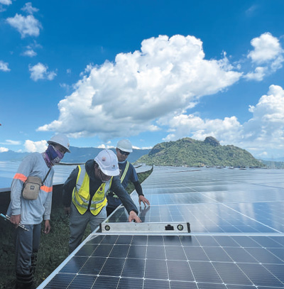 菲律宾圣马塞利诺光伏项目由中国电力建设集团有限公司承建,项目建成后将成为该国最大的光伏电站,每年将为菲律宾供电5.9亿千瓦时。图为中方工程师(中)带领菲方工作人员检查调试光伏支架。