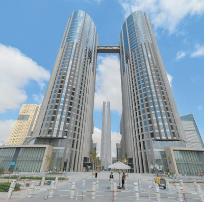 埃及新行政首都中央商务区项目由中国建筑股份有限公司埃及分公司承建,项目建成将对推动当地发展具有重要意义。图为该项目中的标志塔和双子塔。