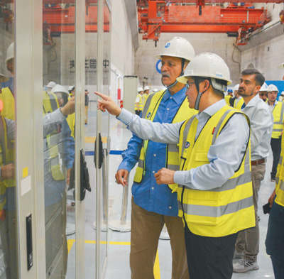 巴基斯坦卡洛特水电站是中巴经济走廊首个水电投资项目,由中国三峡集团投资开发建设,运营一年来节约标准煤约140万吨,减少二氧化碳排放约350万吨。图为中方技术人员向来访的巴基斯坦代表团介绍水电站运行情况。