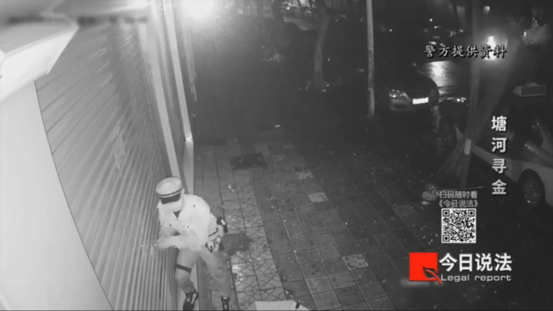 被盗金店外的公共视频记录了嫌疑人破门而入的全过程。画面中,嫌疑人前后17次对卷帘门尝试技术开锁,并在开锁过程中保持了高度警觉,看到行驶的车辆和行人会马上停止动作。为了防止被人追缉,他还向地面撒上铁钉,最终搬开卷帘门进入店内。