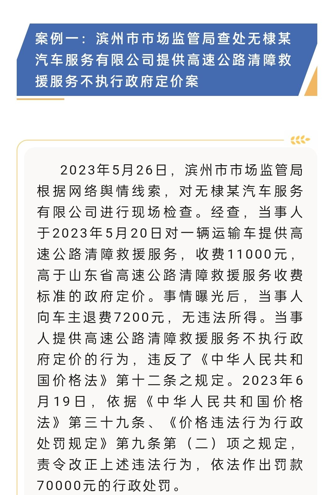 2023年5月26日,滨州市市场监管局根据网络舆情线索,对无棣某汽车服务有限公司进行现场检查。经查,当事人于2023年5月20日对一辆运输车提供高速公路清障救援服务,收费11000元,高于山东省高速公路清障救援服务收费标准的政府定价。事情曝光后,当事人向车主退费7200元,无违法所得。当事人提供高速公路清障救援服务不执行政府定价的行为,违反了《中华人民共和国价格法》第十二条之规定。2023年6月19日,依据《中华人民共和国价格法》第三十九条、《价格违法行为行政处罚规定》第九条第(二)项之规定,责令改正上述违法行为,依法作出罚款70000元的行政处罚。