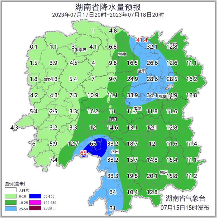 湘西、湘北多云,其他地区阴天间多云有小到中等阵雨或雷阵雨,其中株洲南部、郴州南部、永州南部部分地区大雨,汝城、桂东、资兴、宜章暴雨 ;湘南北风2~3级加大到3~4级,其他地区北风2~3级;最高气温湘南29~31℃,其他地区31~33℃;最低气温湘西20~22℃,其他地区22~24℃。