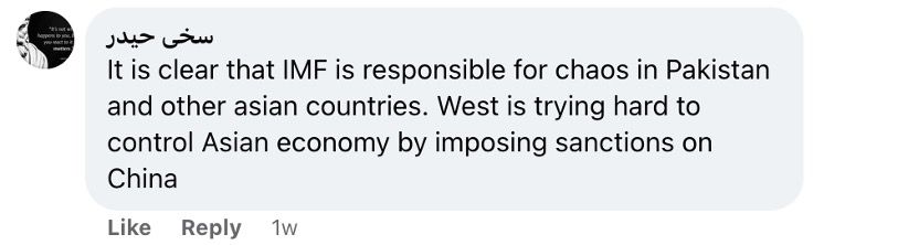 还有网友留言说:“国际货币基金组织对巴基斯坦和其他亚洲国家的混乱负有责任,这一点再清楚不过了。西方试图通过制裁中国来控制亚洲经济。”