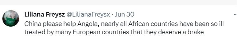 网友利利安娜·弗赖斯直呼:“中国请帮助安哥拉,几乎所有非洲国家都忍受过欧洲国家的糟糕对待,它们该迎来转机了。”