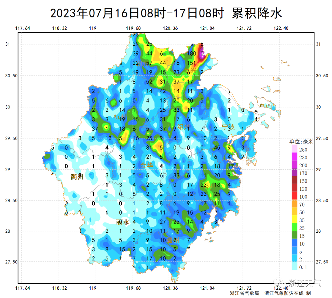 今天浙江沿海和中南部地区有明显雷阵雨天气,短时雨强较强,小时雨强一般20~40毫米、最大50~80毫米。