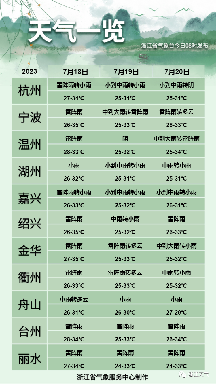 7月18-21日雷阵雨范围较广,多分散性、局地性短时强降雨,小时雨强一般30~50毫米、最大可达80~100毫米;22日浙西部分地区有雷阵雨。另外以上有雷雨地区伴有强雷电和局地8~10级雷雨大风。