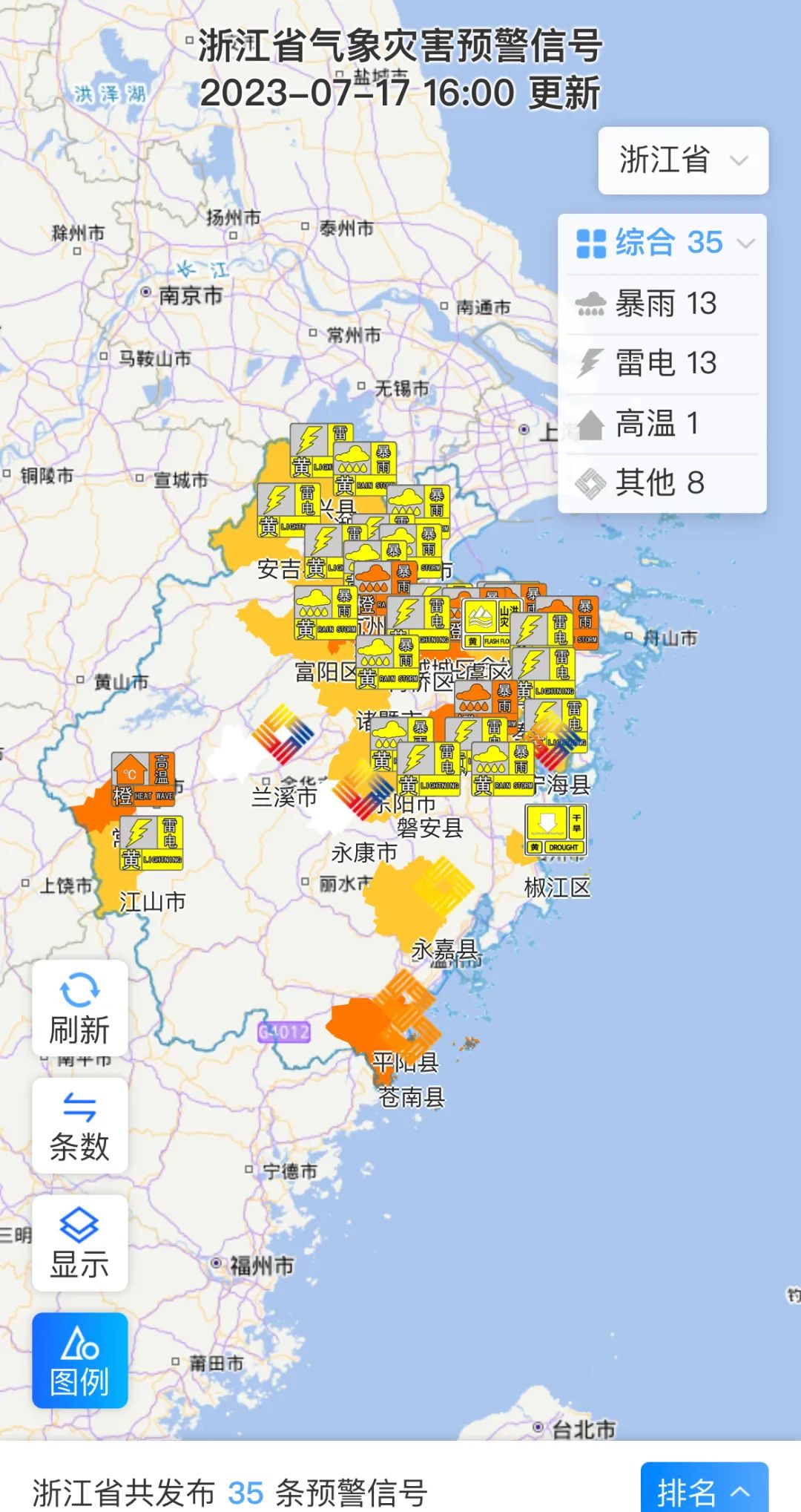 今日16时,浙江共发布35条预警信号,其中暴雨预警13条。