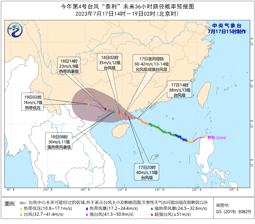 预计“泰利”将以每小时20-25公里的速度向西偏北方向移动,强度缓慢加强,并于今天夜间在广东电白到海南文昌一带沿海登陆(台风级或强台风级,38-42米/秒,13-14级),18日凌晨进入北部湾,将于18日上午在广西沿海再次登陆(强热带风暴级,25-30米/秒,10-11级),19日在越南北部减弱消散。