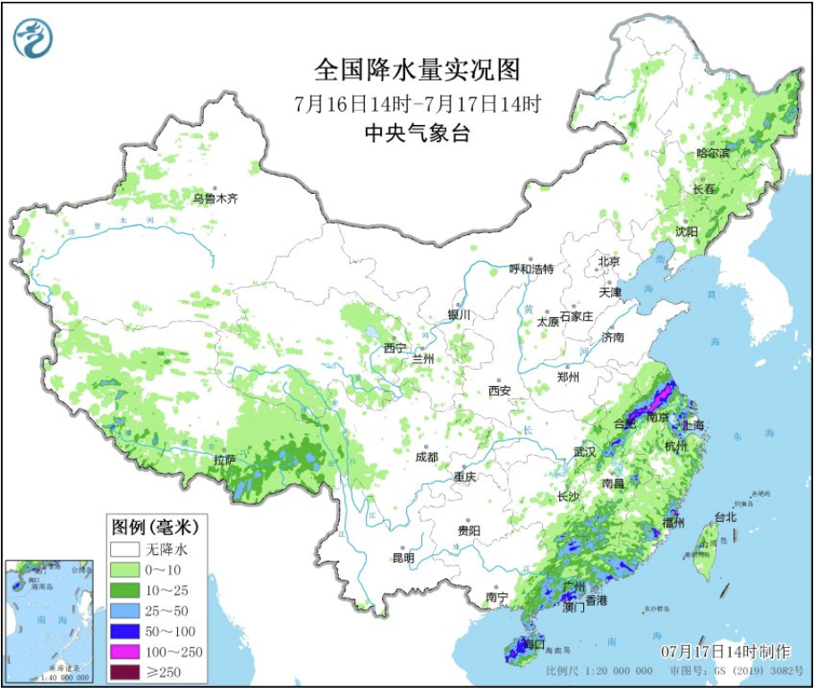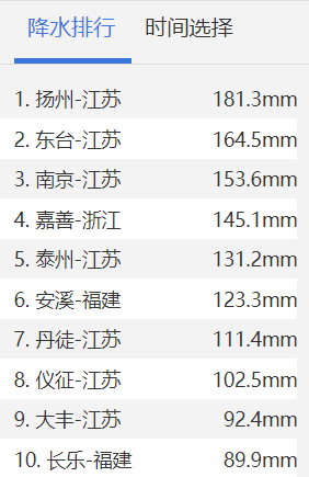 7月17日14时全国24小时降水排行榜上,前十名集中出现在江苏、浙江、福建。来源:中央气象台网站