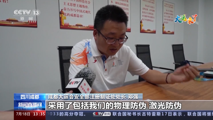 成都大运会安全部注册制证处处长 邓强:身份注册卡的防伪技术,采用了包括物理防伪、激光防伪和电子数据的防伪多重技术为一身,每一个验证点位的工作人员,都会有一个偏振片,把它放在整个证件的激光贴标上进行旋转的话,它会呈现出满天星和一个蓉宝形象的转换。这样能够最简单、最快速地识别出证件真伪。另外,在卡面上有花纹,包括彩色的条,这都是一些防伪技术。