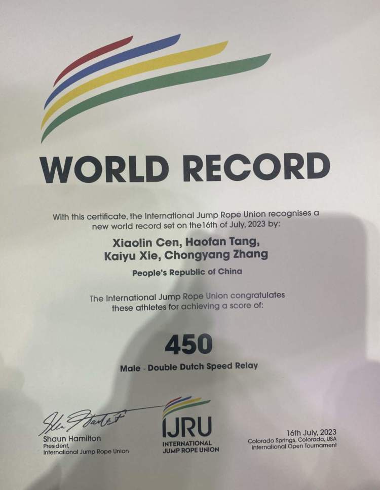 当地时间16日,在美国科罗拉多举办的2023年世界跳绳锦标赛系列赛上,由岑小林、唐颢凡、张崇杨、谢凯宇组成的中国跳绳国家队在男子组4×30秒交互绳接力比赛中夺得冠军,并以450次的成绩打破世界纪录。