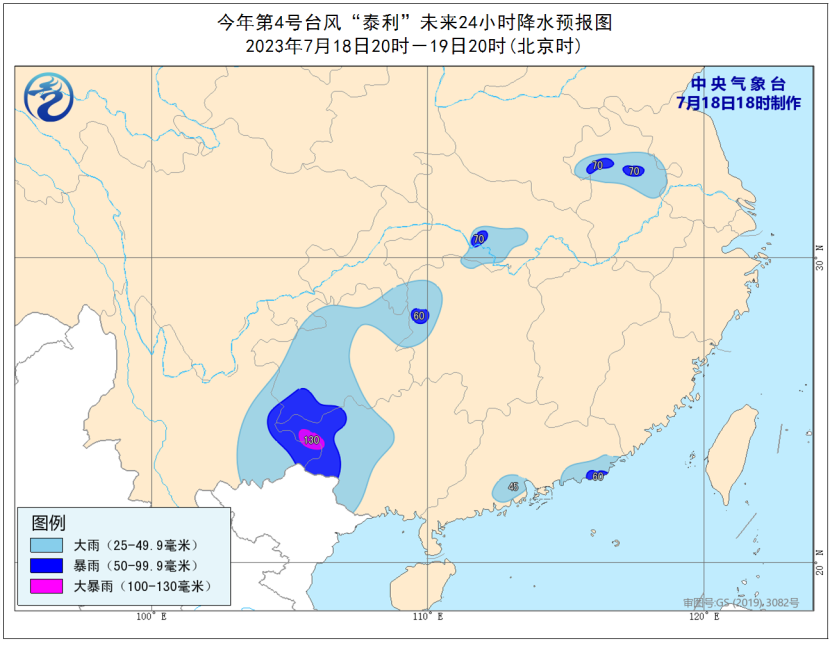 7月18日20时至19日20时,广东沿海、广西西部、云南东南部、贵州中西部和北部、湖南西部、湖北中部、安徽中北部等地的部分地区有大到暴雨,其中,云南东南部、广西西北部等局地有大暴雨(100-130毫米)。
