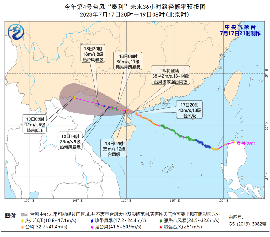 昨天(7月17日)夜间22时20分,今年第4号台风“泰利”在湛江市坡头区南三岛沿海登陆,中心附近最大风力13级(38米/秒);今晨5时45分前后,“泰利”在广西北海市再次登陆;11时在防城港市附近第三次登陆,12时左右减弱为热带风暴,但强风雨仍然持续中。据中央气象台监测,预计“泰利”将继续以每小时20公里左右的速度向西偏北方向移动,强度逐渐减弱,将于19日凌晨在越南北部减弱消散。