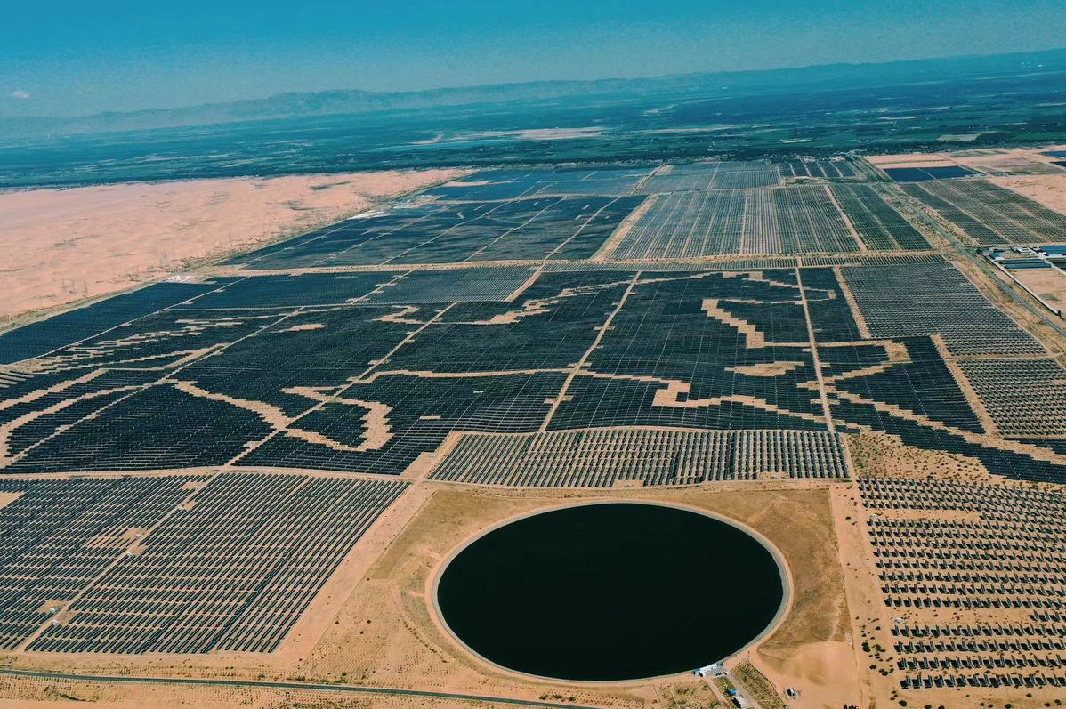 位于库布其沙漠腹地的达拉特旗国家发电应用领跑基地,是国内目前在沙漠地区建成集中连片的最大光伏基地。空中俯瞰基地,由19.6万块蓝色光伏板拼接形成的图形,宛如一匹在茫茫黄沙中任意驰骋的蒙古骏马,源源不断为内蒙古生产清洁电力能源。