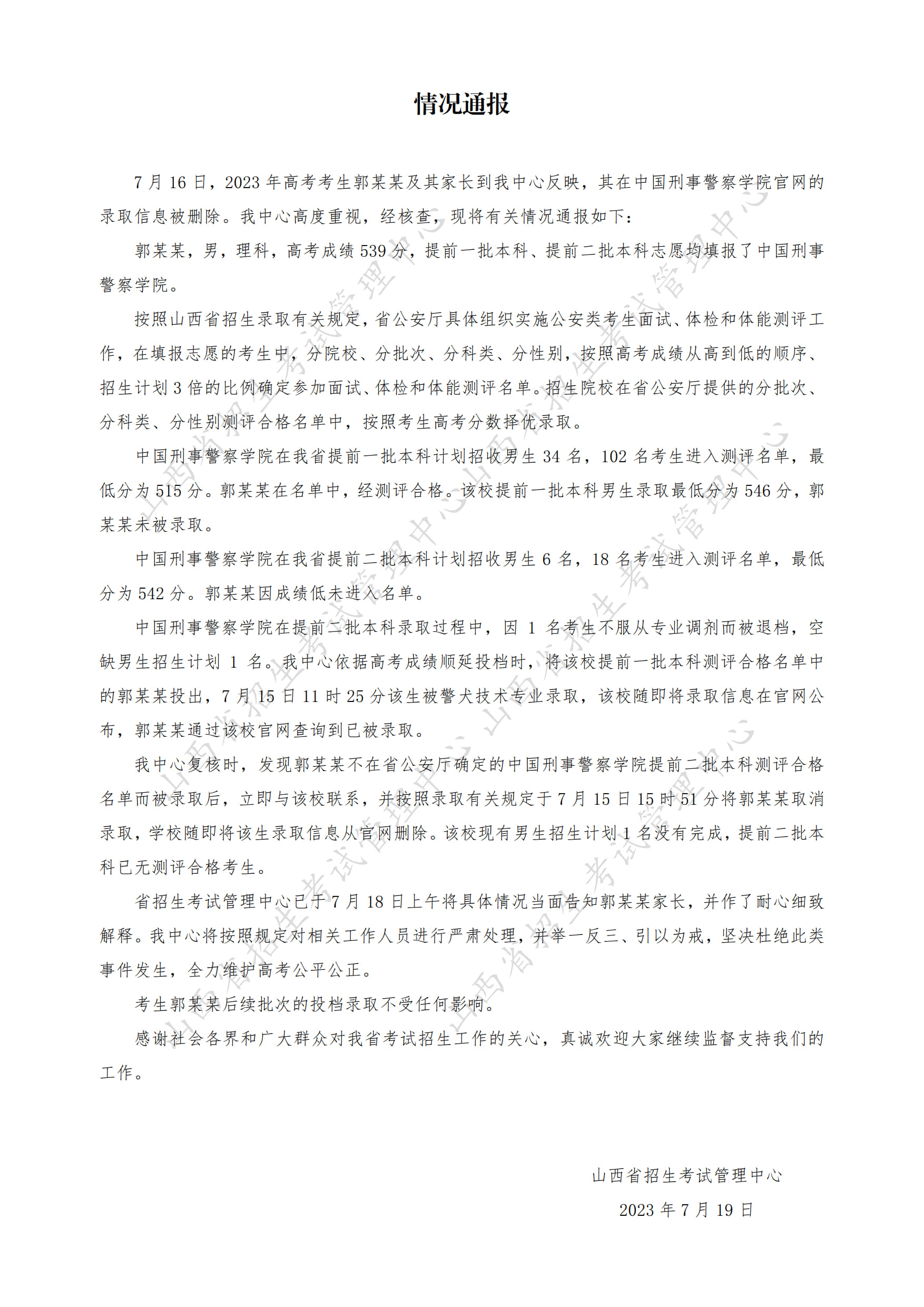 7月 16 日,2023 年高考考生郭某某及其家长到我中心反映,其在中国刑事警察学院官网的录取信息被删除。我中心高度重视,经核查,现将有关情况通报如下: