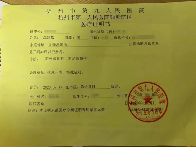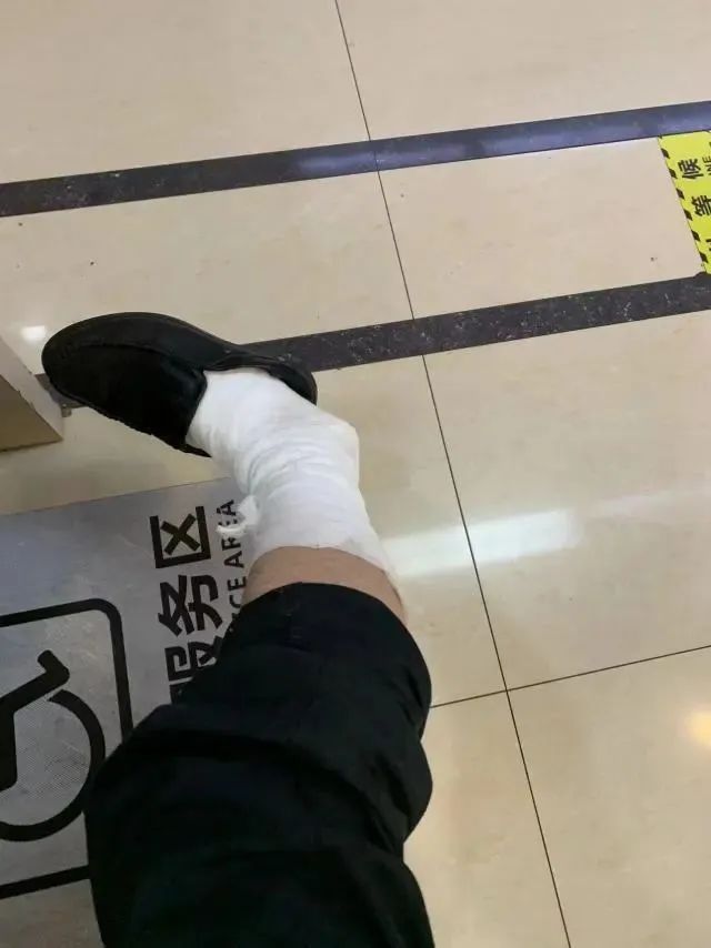 当晚,在王佳聪的搀扶下,沈建松去拍了X光片,经诊断是右脚右外踝骨折,右足部损伤。 打上石膏前,沈建松戳了戳红肿的右脚,疼得他龇牙咧嘴,还不忘跟同事开玩笑道:“还以为只是普通扭伤,没想到真骨折了。”