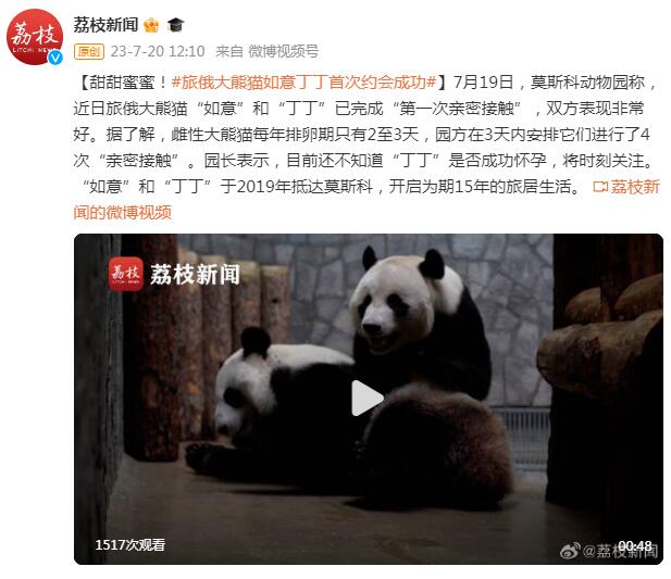 7月19日,莫斯科动物园称,近日旅俄大熊猫“如意”和“丁丁”已完成“第一次亲密接触”,双方表现非常好。据了解,雌性大熊猫每年排卵期只有2至3天,园方在3天内安排它们进行了4次“亲密接触”。园长表示,目前还不知道“丁丁”是否成功怀孕,将时刻关注。“如意”和“丁丁”于2019年抵达莫斯科,开启为期15年的旅居生活。