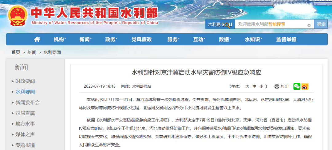 依据《水利部水旱灾害防御应急响应工作规程》,水利部决定于7月19日18时针对北京、天津、河北省(直辖市)启动洪水防御Ⅳ级应急响应,派出2个工作组赴北京、河北协助做好防御工作,并向相关省级水利部门和水利部海河水利委员会发出通知,要求密切监视天气变化,加强雨情水情预测预报、会商研判和应急值守,做好水工程调度、中小河流洪水防御、山洪灾害防御等工作,确保人民群众生命财产安全。