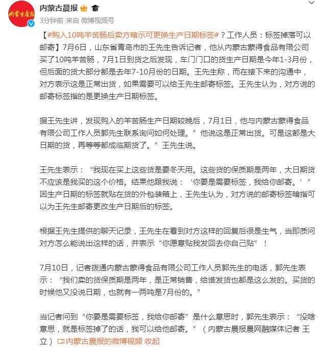 据王先生讲,发现购入的羊苦肠生产日期较晚后,7月1日,他与内蒙古蒙得食品有限公司工作人员郭先生联系询问如何处理。”他说这是正常出货。可是这都是大日期的货,再等等都成临期货了。”王先生说。