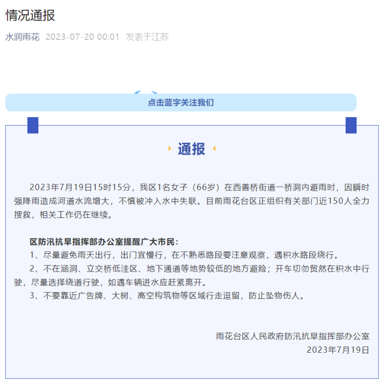 2023年7月19日15时15分,我区1名女子(66岁)在西善桥街道一桥洞内避雨时,因瞬时强降雨造成河道水流增大,不慎被冲入水中失联。目前雨花台区正组织有关部门近150人全力搜救,相关工作仍在继续。