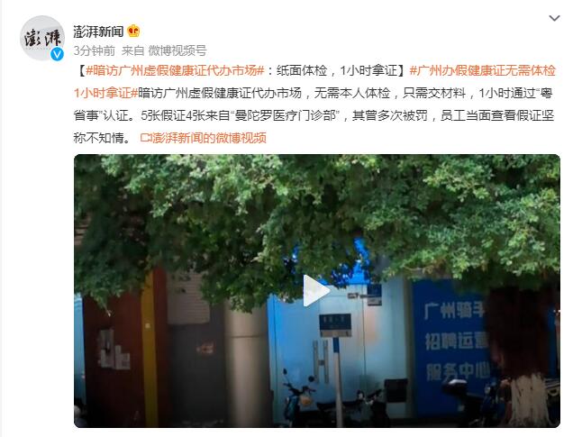 暗访广州虚假健康证代办市场,无需本人体检,只需交材料,1小时通过“粤省事”认证。5张假证4张来自“曼陀罗医疗门诊部”,其曾多次被罚,员工当面查看假证坚称不知情。